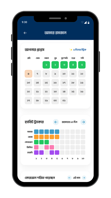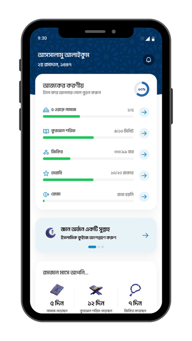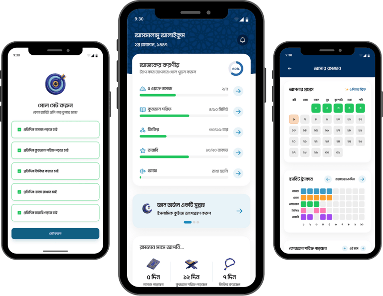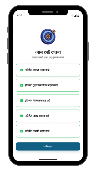 নামাজ পড়া, কুরআন তেলাওয়াত করা, রোজা রাখা, দোয়া, জিকির সহ আপনার দৈনন্দিন আমলের গোল সেট করুন আর ট্র্যাক করুন সহজেই
